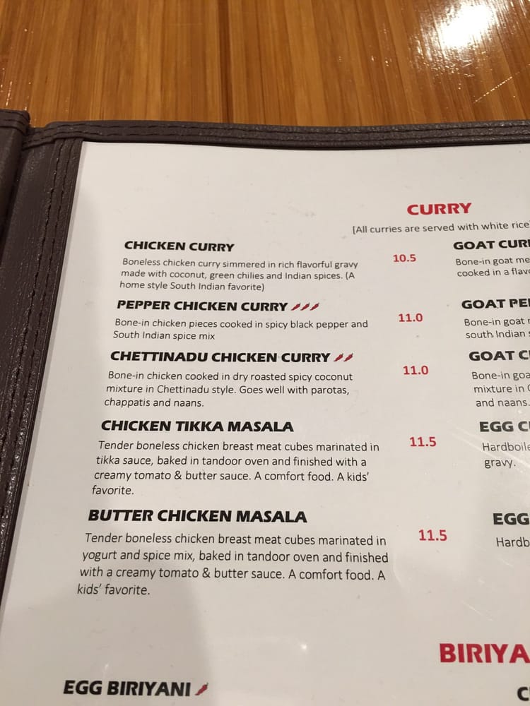 Medium spicy. Bone-in chicken curry simmered in flavorful gravy made with coconut, green chilies and Indian spices.